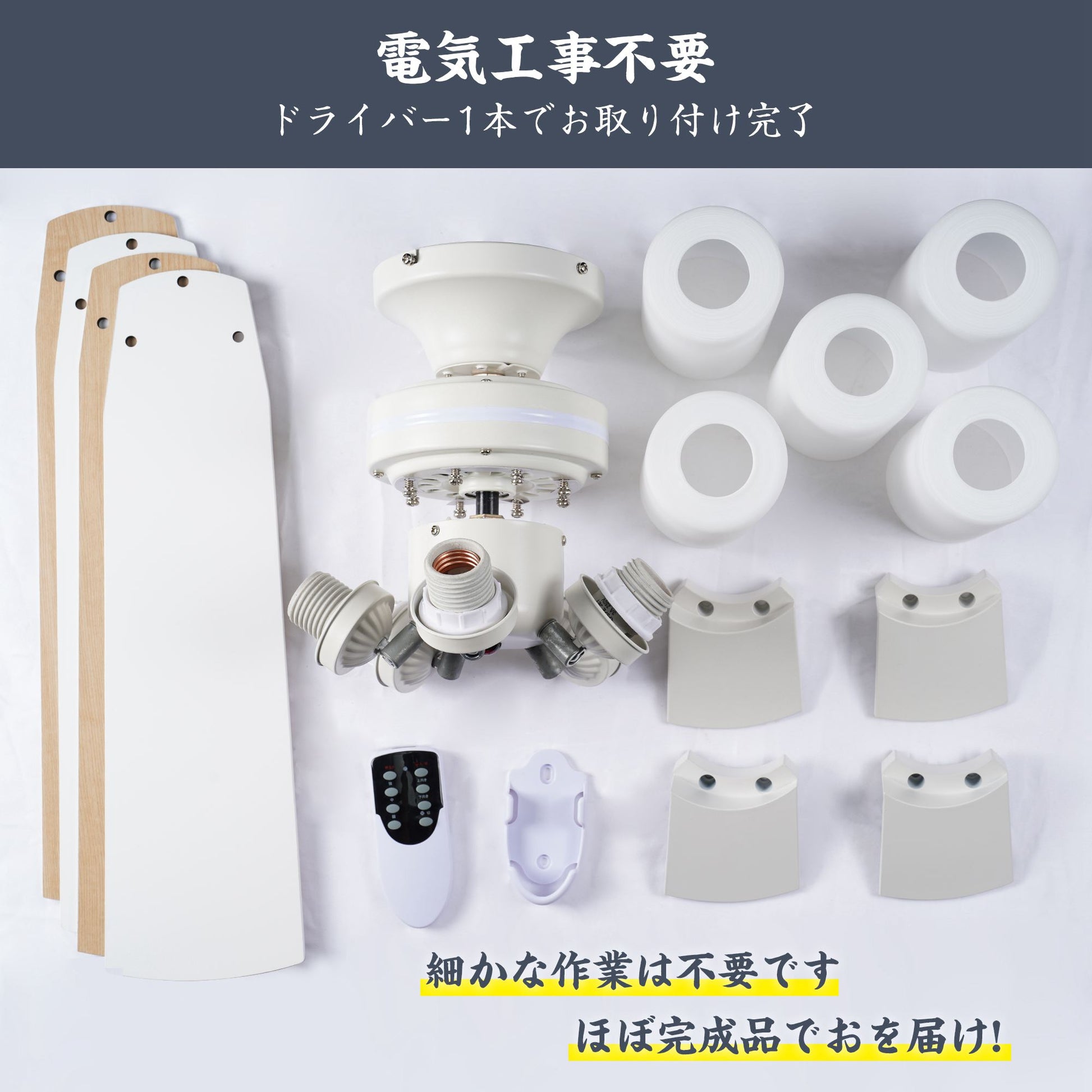本商品は専用のリモコンが付属します、風量、風向さ、回転速度、明るさの切り替えの調節など全て手元で行えます。点灯する電球を変更して明るさを調整できます、リモコンの風向き切替ボタン、回転速度切替ボタンを操作することで風量や風の向きを変更可能です。これ一つで、お部屋の明かりをコントロール!