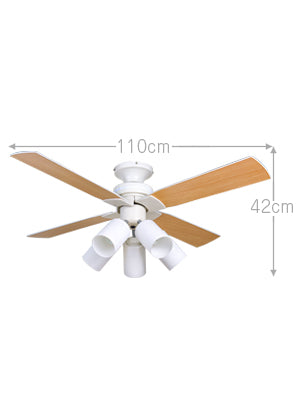 - 仕様:色:ブラック 羽根回転直径:約110cm 全高:約42cm 重量:約5.8KG ファンの回転速度切替:リモコン式(3階段) ファンの風向き切替:リモコン式(正転/逆転) ファンの回転:弱・中・強 明るさの切り替え:リモコン式(点灯:5灯・3灯・2灯) 電源電圧:AC100V(50/60HZ) 照明(口金サイズE26):白熱電球60W*5灯(最大300W) 最適な部屋の大きさ:6畳 照明を含まない消費電力:35W 羽根:プリント合板4枚(リバーシブル使用) 最適な羽根の高さ:床から220~250cm リモコンの電源:単4乾電池*2本 生産国:中国製 ●サイズ:幅1100mm*奥行1100mm*高さ420mm ●構造素材、本体:スチール 羽根:プリント紙化粧繊維板 シェード:積層材(曲げ木)/スチール